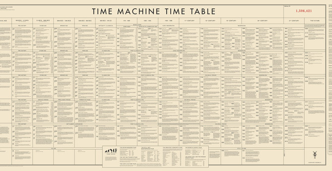 The updated Time Table now includes all the continents, newly curated Time Tours and handy advice for the novice Time Traveller. It is the only Time Table approved and distributed by the Time Travel Ministry. No self-respecting Time Traveller would leave home without it. And you can be back before your partner has chance to say, “Did you see where that phone bill went?”